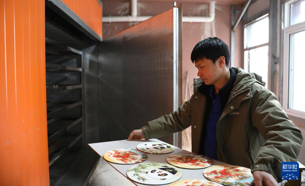 2月27日,刘晶涛的徒弟王艺在凤城市边门镇的车间里将画板放入干燥箱。