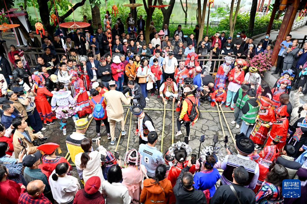 在柳州市鱼峰公园,市民和游客在庆祝“三月三”活动中一起跳竹竿舞(4月8日摄)。