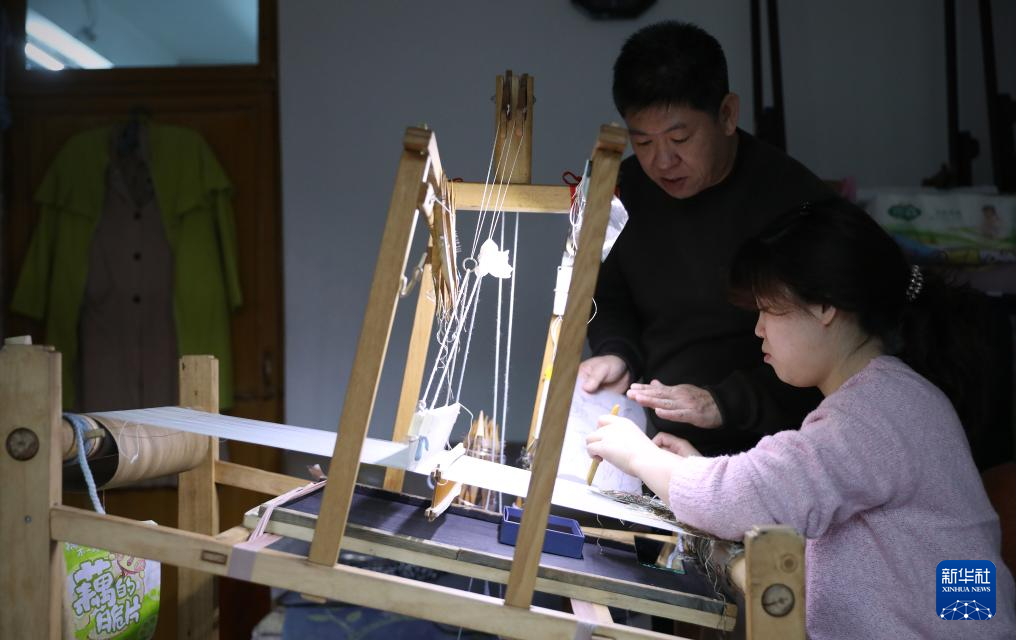 4月9日,申涛在位于营口市的家中指导女儿申圣丹进行缂丝创作。