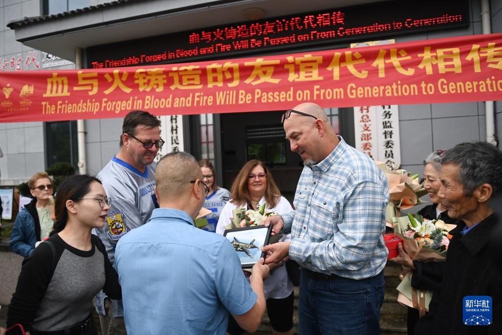 在衢州江山市大桥镇芳源村,获救美国军人后代回访“杜立特行动”威尔德降落点(4月16日摄)。1942年,“杜立特行动”5号机飞行员罗斯·威尔德曾在村民毛光孝等的救援下安全转移。