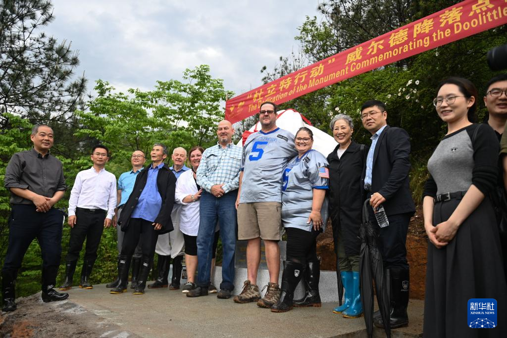 在衢州江山市大桥镇芳源村,获救美国军人后代与村民代表一同出席“杜立特行动”威尔德降落点标识落成仪式(4月16日摄)。1942年,“杜立特行动”5号机飞行员罗斯·威尔德曾在村民毛光孝等的救援下安全转移。