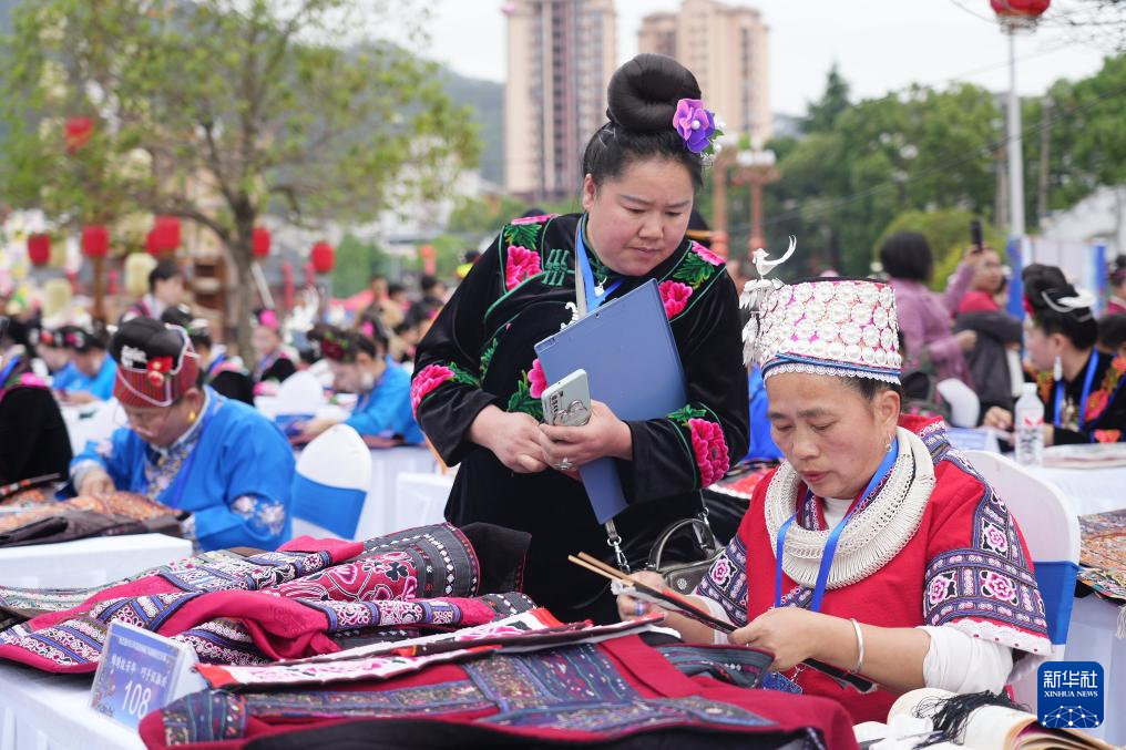 4月21日,苗族妇女在台江县参加苗族刺绣大赛。