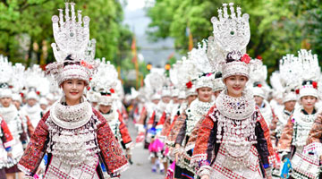 4月21日,苗族群众参加台江苗族姊妹节盛装游演。