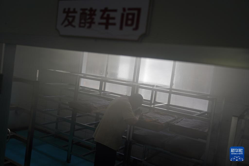 江西省修水县漫江乡的宁红茶制茶基地,俞旦华查看茶叶的发酵情况(3月29日摄)。