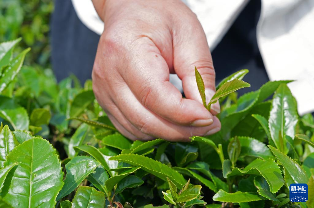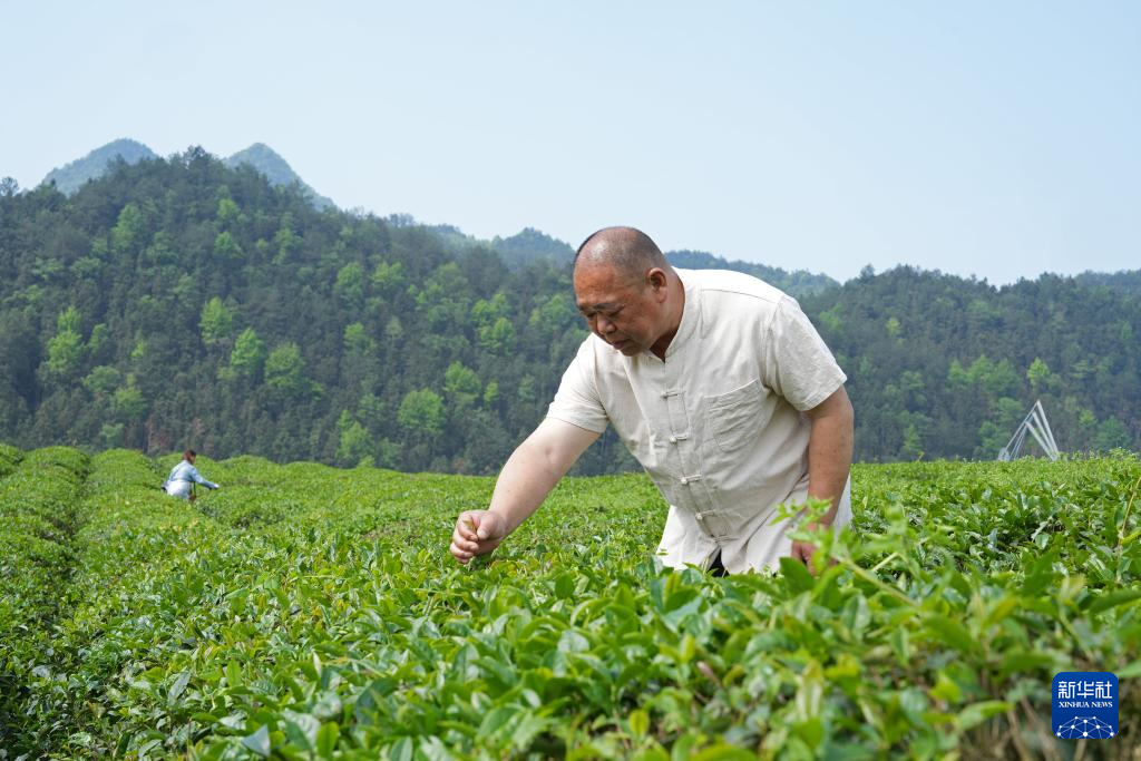 江西省修水县漫江乡的宁红茶制茶基地茶园中,俞旦华查看茶叶生长情况(4月24日摄)。