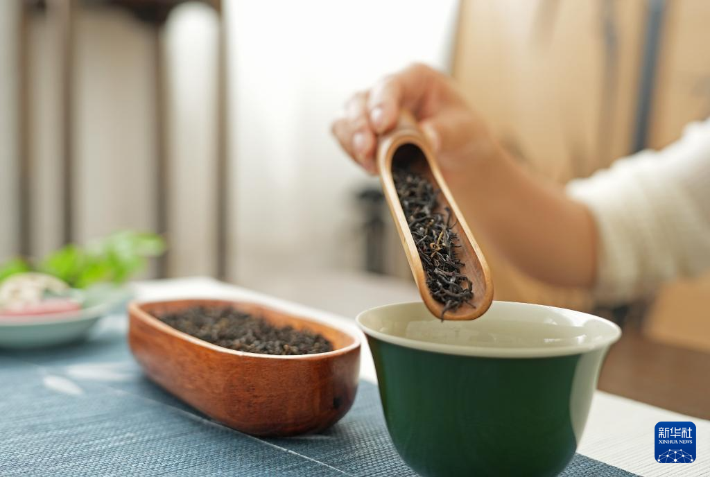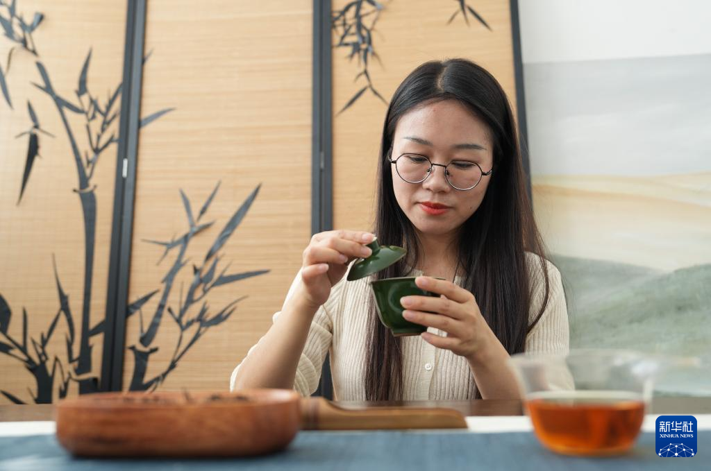 江西省修水县漫江乡的宁红茶制茶基地,一位女士在泡宁红茶(4月24日摄)。