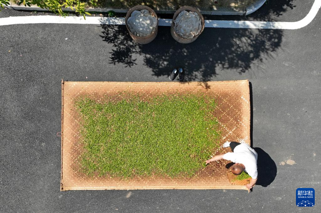 江西省修水县漫江乡的宁红茶制茶基地,俞旦华对茶叶进行传统萎凋工序(3月29日摄,无人机照片)。