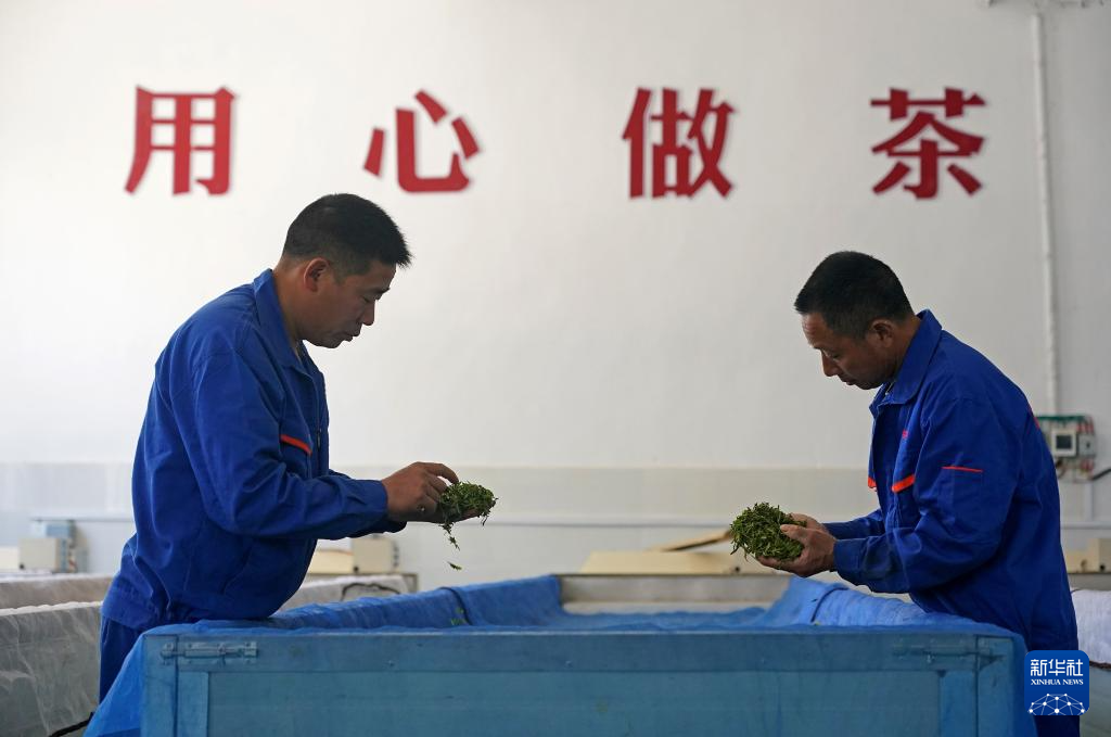 江西省修水县漫江乡的宁红茶制茶基地,制茶师傅查看茶叶的萎凋情况(3月29日摄)。