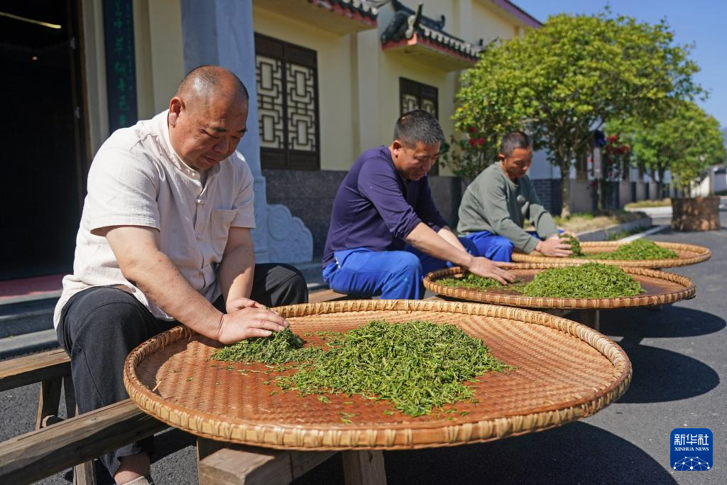 江西省修水县漫江乡的宁红茶制茶基地,俞旦华对茶叶进行传统萎凋工序(3月29日摄)。