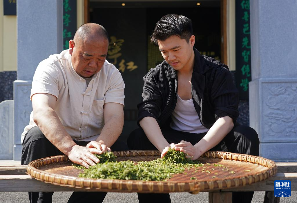 江西省修水县漫江乡的宁红茶制茶基地,俞旦华(左)向青年员工展示传统的揉捻手法(3月29日摄)。