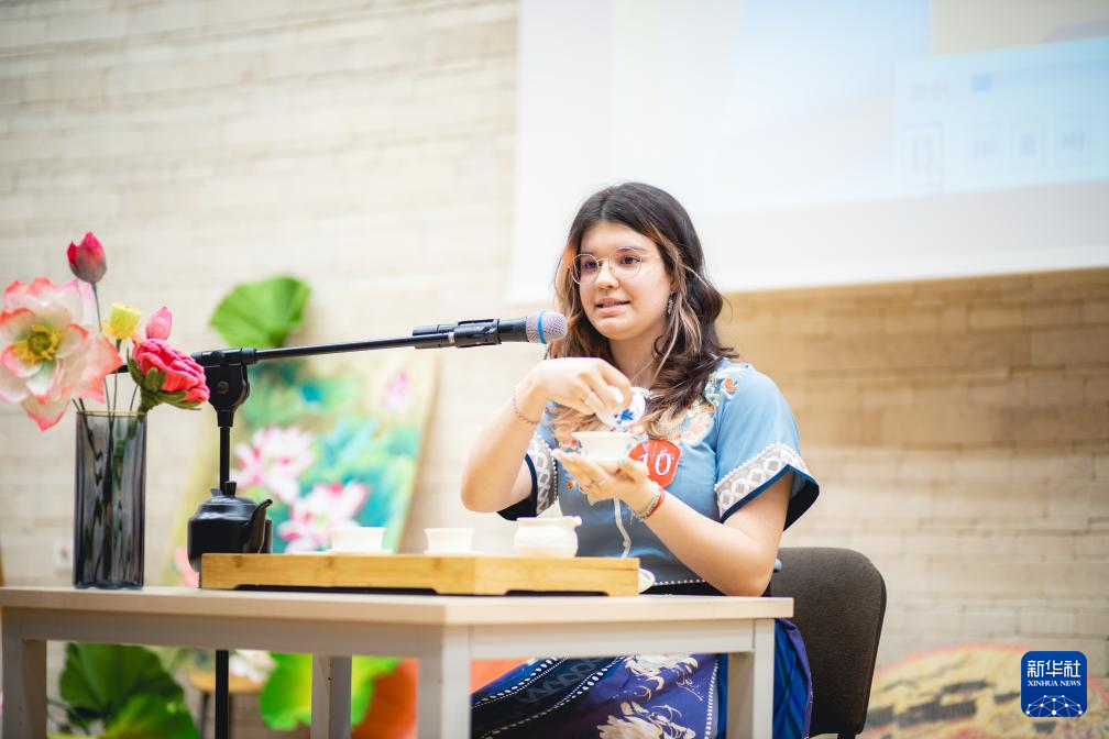 4月27日,在罗马尼亚锡比乌,一等奖获得者德艺燃(中文名)在第17届“汉语桥”世界中学生中文比赛罗马尼亚赛区决赛中表演茶艺。