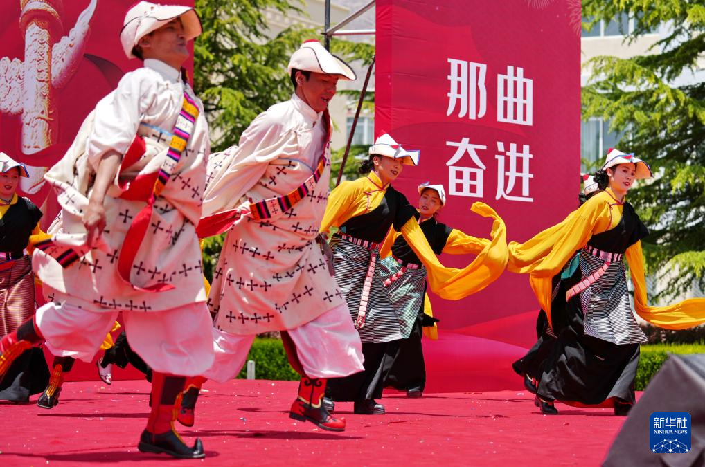 5月12日,在西藏职业技术学院职业教育活动周启动仪式暨比如县非物质文化遗产进校园活动上,比如县民族艺术团的演职人员在表演节目。