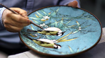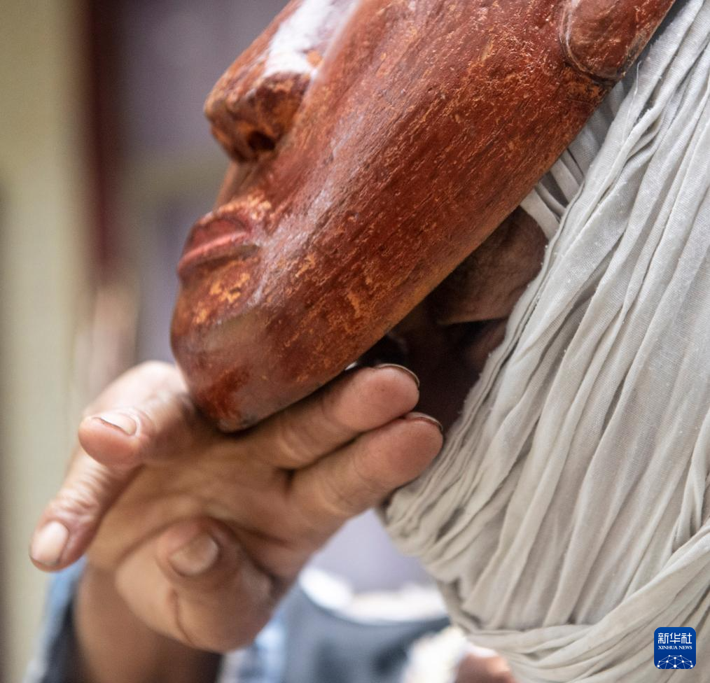 陈永霞习惯性地用两指测试面具下沿与双眼间留出的宽度,以便观察舞台环境(5月16日摄)。