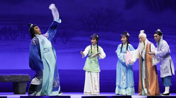 5月16日,在陈家老屋前的桂花树下,身着阳戏戏服的陈永霞(左一)与戏搭子练习。