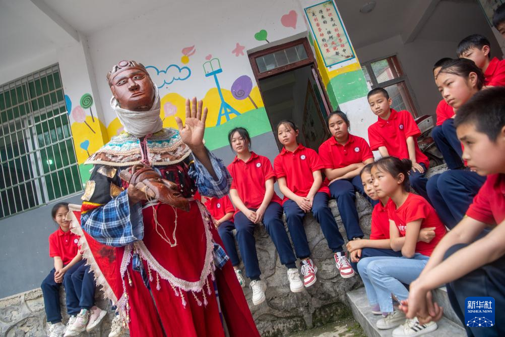 5月17日,在酉阳县丁市镇溪口小学校,陈永霞(左一)带领小学生们体验阳戏的剧目片段。