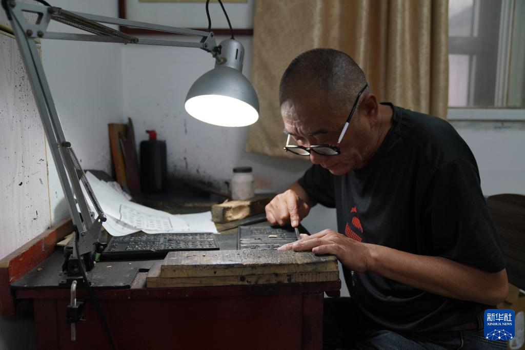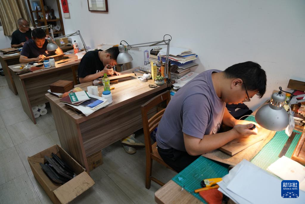 6月27日,在金陵刻经处技艺展示区,工作人员在刻版。