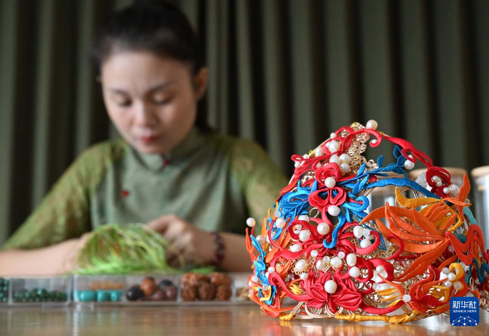 楚蒙丹在位于洛阳市的非遗体验馆里查看一件传统饰品,学习辑珠技艺的手法和配色(9月12日摄)。