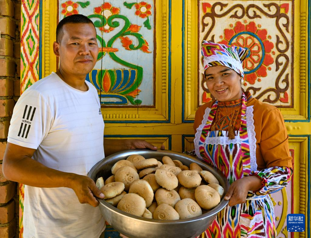 村民艾力·艾孜布力(左)和妻子赛丽米罕·斯迪克展示刚烤制出炉的馕(10月8日摄)。