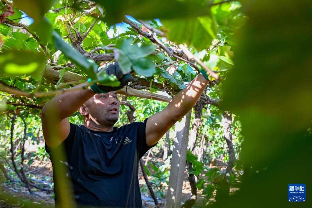 村民吾拉音·斯迪克在修剪葡萄叶(10月8日摄)。