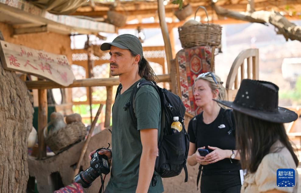 两名国外游客在新疆鄯善县吐峪沟乡吐峪沟村游玩观光(10月6日摄)。