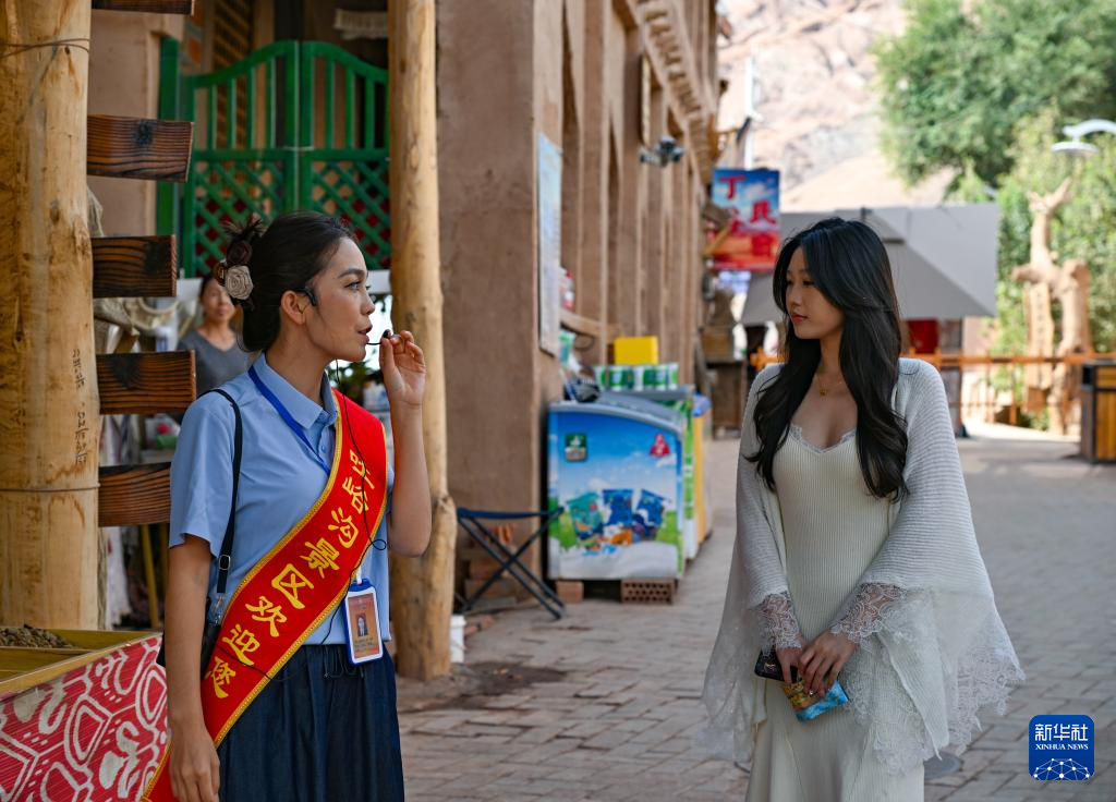 吐峪沟景区导游麦尔哈巴·阿卜力克木(左)在为游客介绍景区(10月7日摄)。