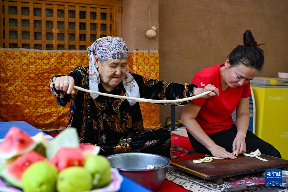 村民妮热孜罕·麦合木提(左)和孙女帕提古丽·加帕尔在家中制作午饭(10月8日摄)。