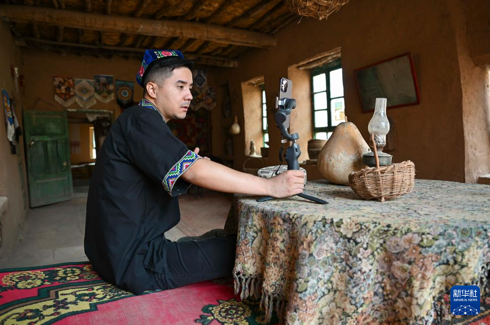 在新疆鄯善县吐峪沟乡吐峪沟村,一位青年主播向网友介绍村里的风景、文化、特产等(10月7日摄)。