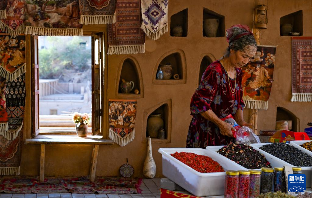 村民在吐峪沟景区内售卖葡萄干(10月8日摄)。