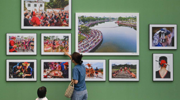 10月13日,在“守护雨林家园——海南热带雨林国家公园建设主题展”现场,观众与海南热带雨林背景墙留影。