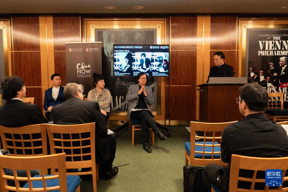 10月12日,在美国纽约,两国作曲家在第七届中国当代音乐节开幕音乐会前举行的第二届美中音乐论坛上探讨音乐创作。