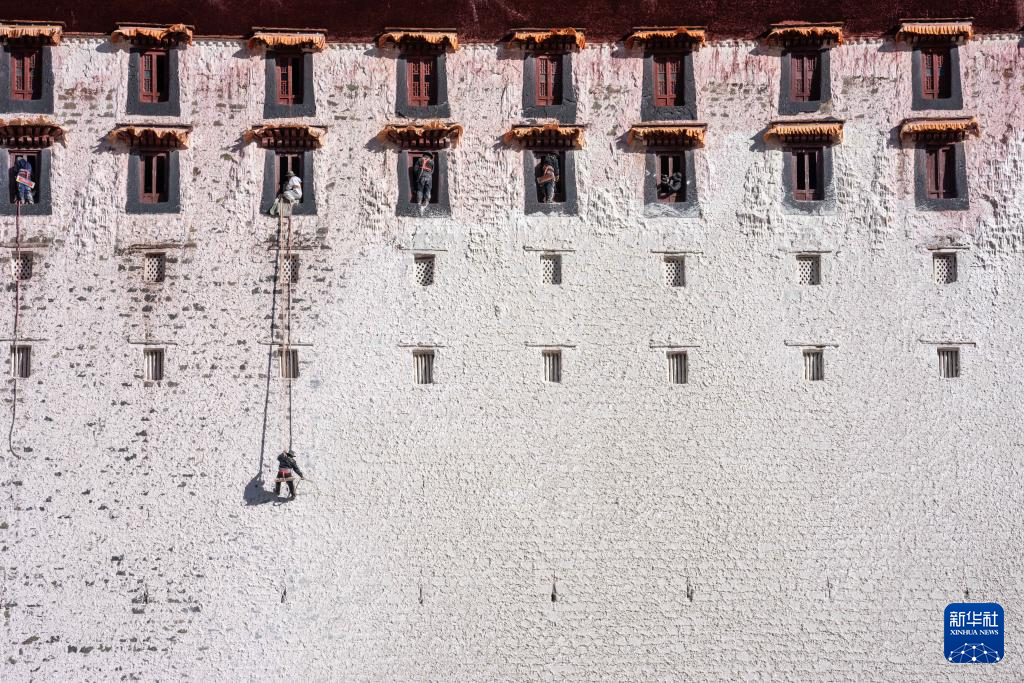 10月31日拍摄的布达拉宫年度外墙粉刷工作现场。