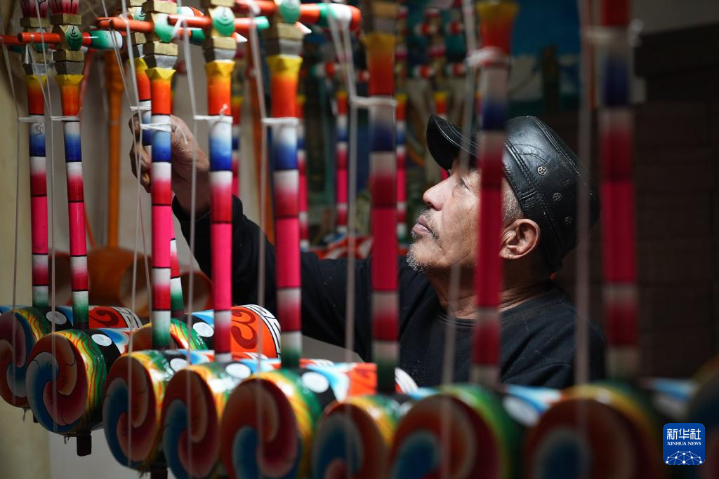 11月5日,在四川省甘孜藏族自治州巴塘县,王扎西在家中整理弦胡。在四川省甘孜藏族自治州巴塘县,人们时常跳起弦子舞,这是一种集诗、琴、歌、舞于一体的综合性表演艺术,领舞的弦胡手是表演是否成功的关键。弦胡,通常用柏木做琴筒,在琴杆顶部雕刻龙头宝塔。今年66岁的弦胡手王扎西是“巴塘弦子舞”的省级非遗传承人。为保护并传承弦子舞和弦胡制作技艺,王扎西在自己房屋里建起弦胡制作坊,并在各类活动中表演,展示弦胡的韵律和弦子舞的魅力。