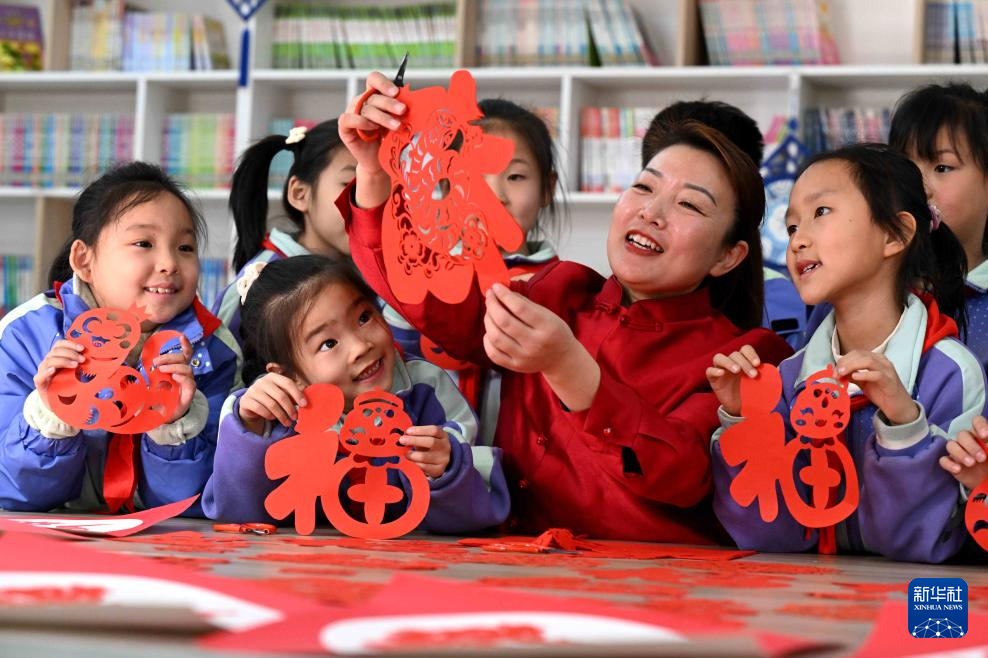 1月13日,剪纸艺人在河北省石家庄市天苑小学教孩子们剪窗花。