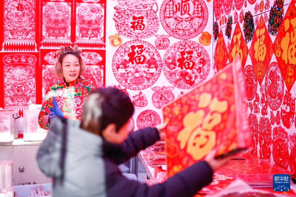1月13日,顾客在河南省焦作市温县赵堡镇年画市场选购新年饰品。