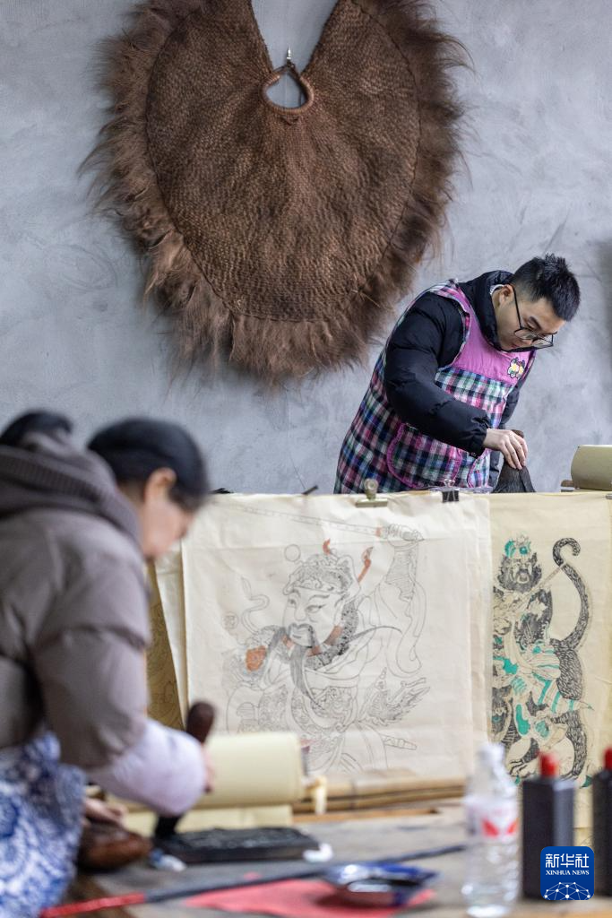 1月14日,在重庆市梁平区屏锦镇,梁平木版年画国家级代表性传承人徐家辉在工作室内为年画描色。