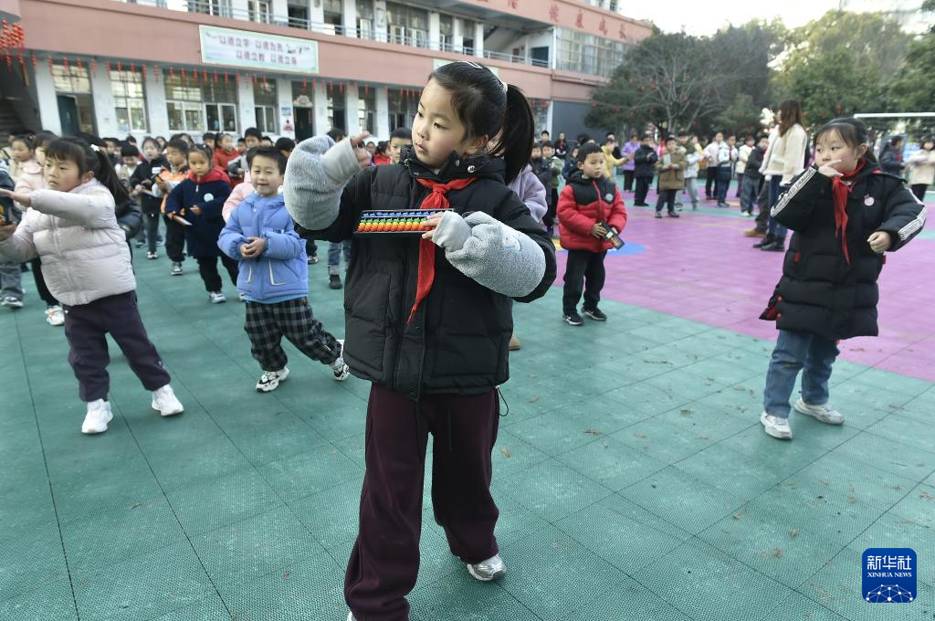 1月9日,在安徽省黄山市屯溪大位小学,学生们课间练习“算盘韵律操”。