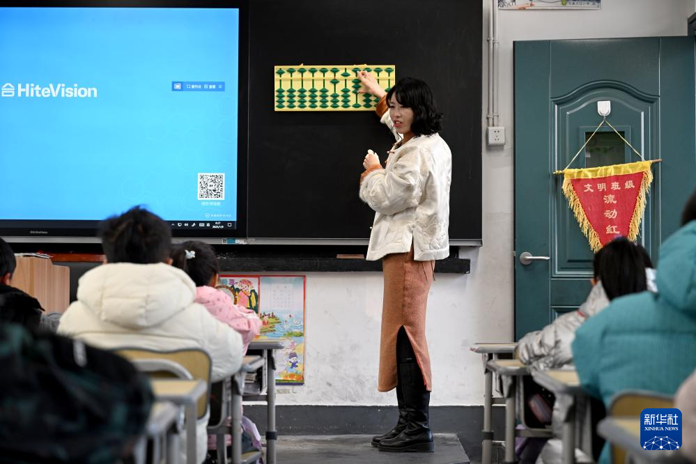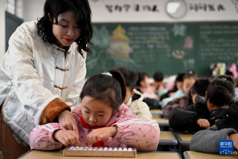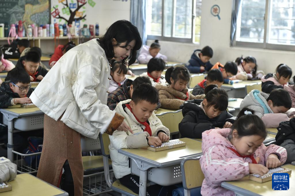 1月9日,在安徽省黄山市屯溪大位小学,汪素秋在教室里指导学生练习珠算。