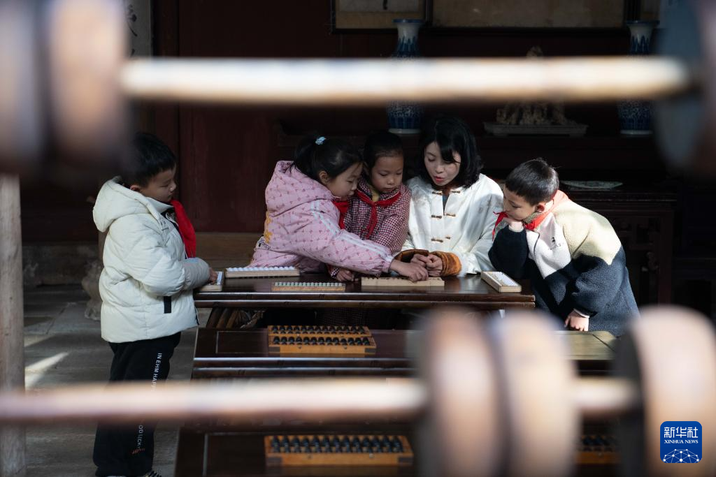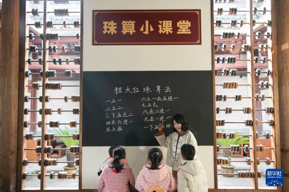 1月9日,在位于安徽省黄山市屯溪区的程大位故居,汪素秋为学生讲解珠算知识。
