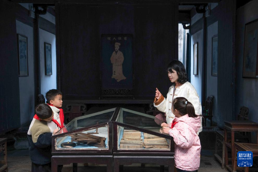1月9日,在位于安徽省黄山市屯溪区的程大位故居,汪素秋(右一)为学生们介绍程大位发明的“丈量步车”。