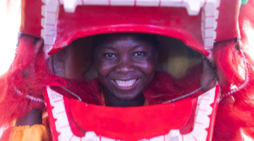 1月22日,在广西桂林市灵川县兰田瑶族乡的牌灯展演现场,一名小朋友参与互动。
