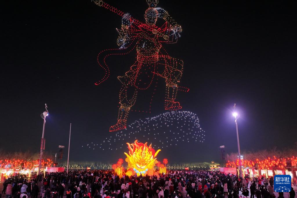 1月22日,市民在唐山南湖春节灯会上观看无人机表演(无人机照片)。