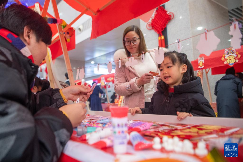 1月23日,在重庆北站候车厅内的新春集市上,一名小朋友在学剪窗花。