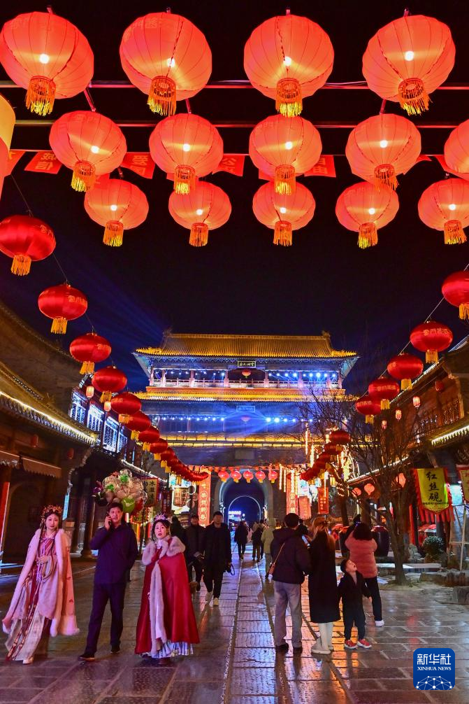 1月22日,游客在甘肃省定西市陇西县北关正街上赏灯游玩。