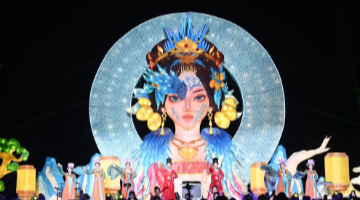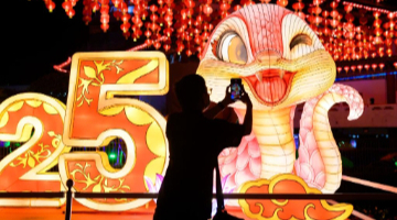 1月17日,游客在新加坡滨海湾花园花穹观赏《春花盛开之白蛇传》花卉展。