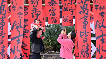 1月29日,游客在山东省临沂市郯城县郯国古城景区观看舞狮表演。