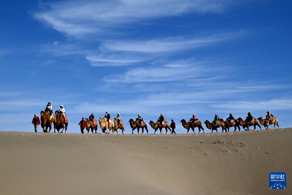 2月4日,游客在甘肃省敦煌市鸣沙山月牙泉景区骑骆驼游览。