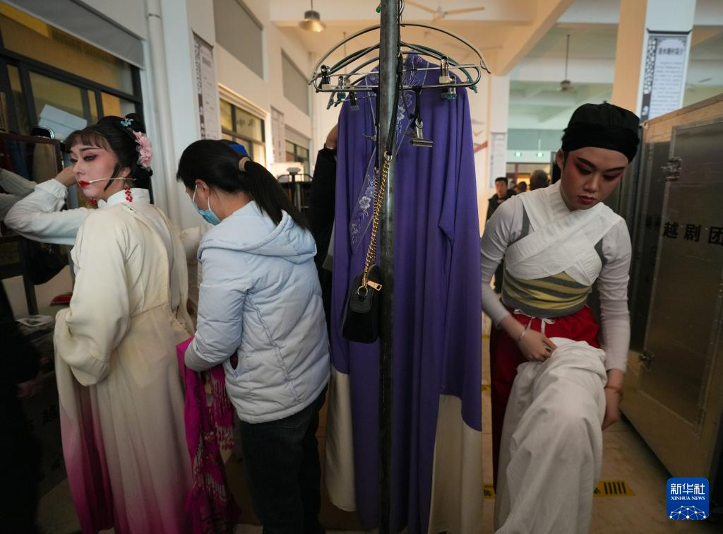 在浙江绍兴嵊州市三界镇清水塘村文化礼堂,下乡演出的嵊州市越剧团演员在临时隔出的区域补妆、更衣(1月21日摄)。