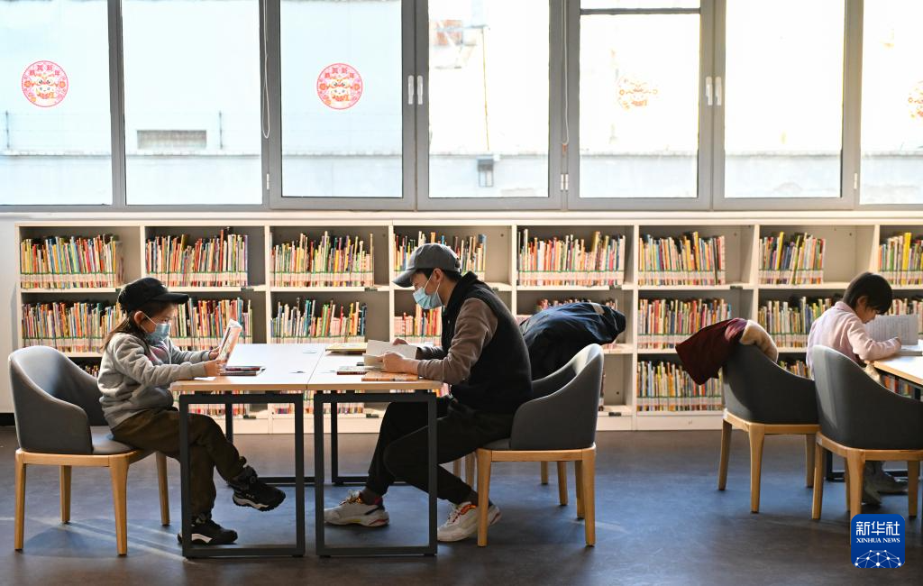 2月9日,在朝阳区图书馆劲松馆青少年阅读区,大小读者一起阅读。