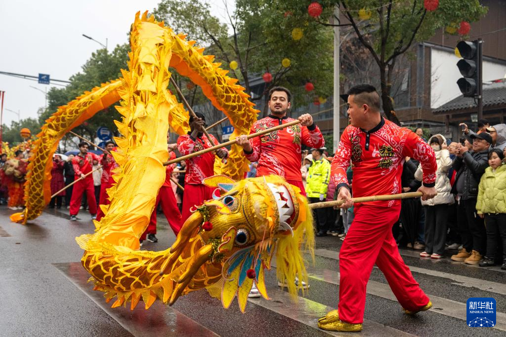 2月12日,外国留学生在张家界市永定区参与舞龙表演。