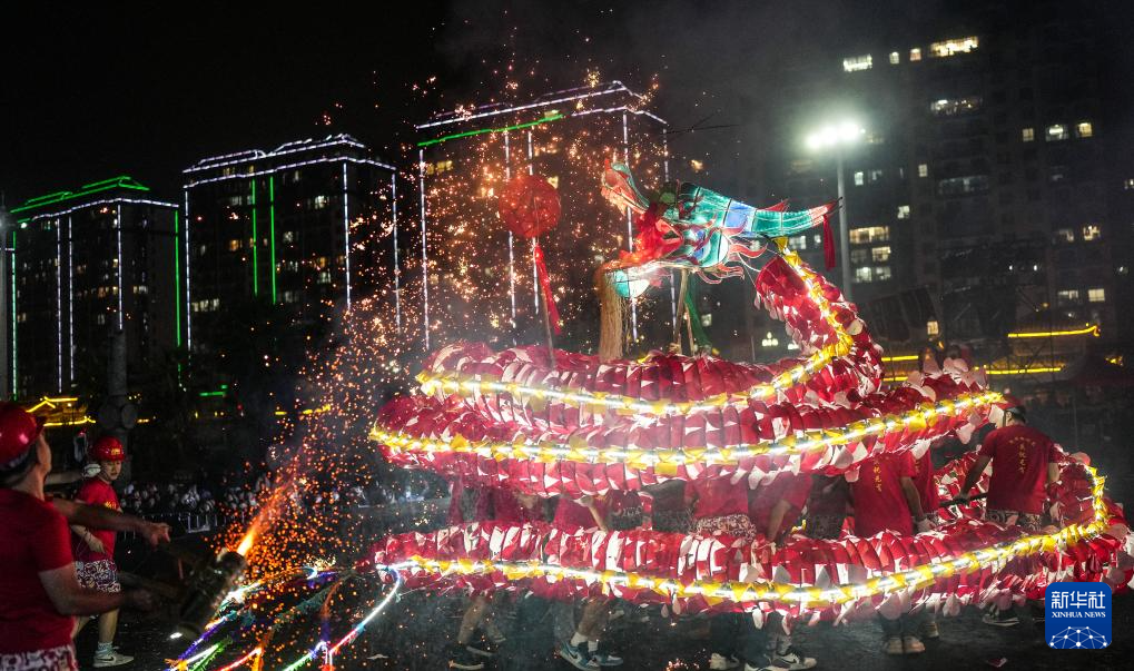 2月11日晚,人们在台江县参加“舞龙嘘花”活动。